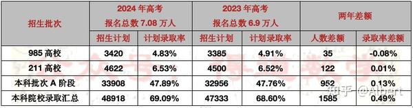 从这个表中可以看出,985和211计划录取率几乎没有变化,而且每年985、211学校最后的招生结果都会多于招生计划,因为存在着保送、特招以及临时增招等特殊情况,比如去年985高校最终的录取人数就是3496人,211高校最终的录取人数是4586人,一共多出了200人左右,因此今年应该还是差不多的情况,985、211高校录取率保持稳定。